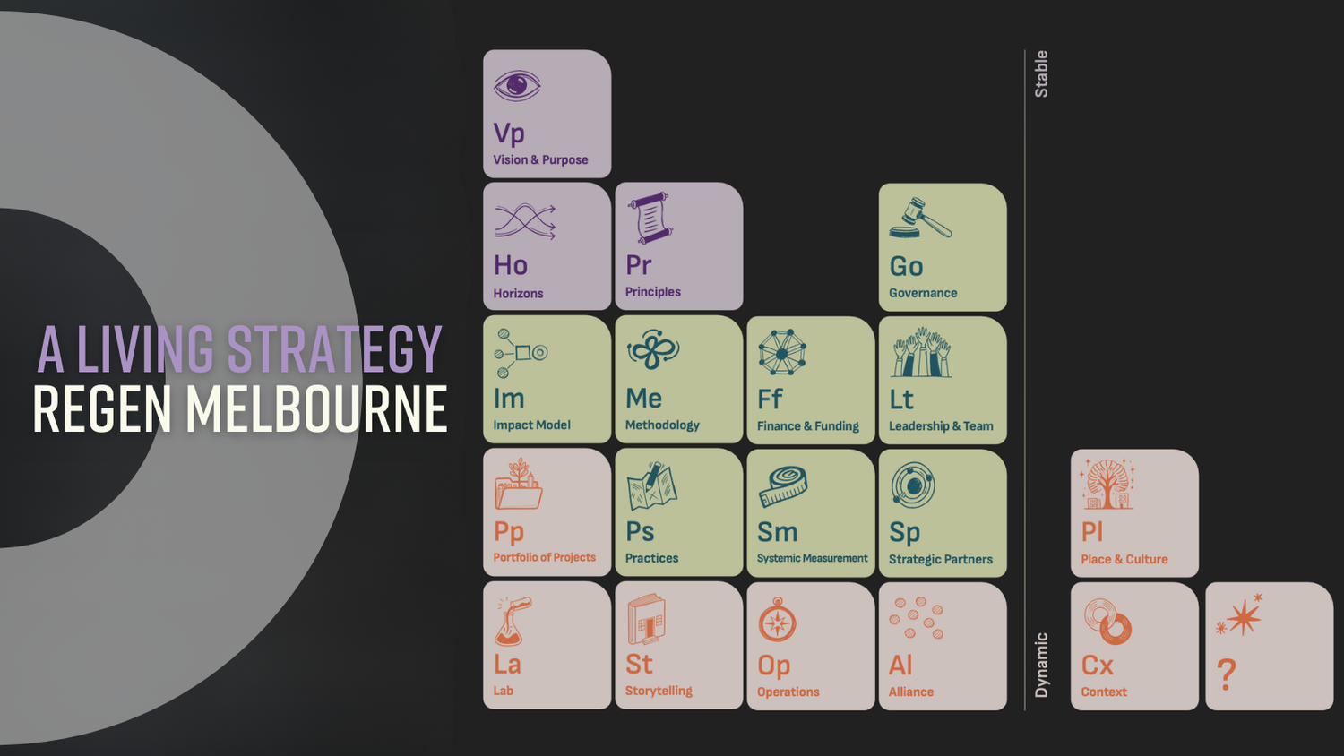 As an example, at the top of the RM periodic table you will see strategic elements like our vision and purpose (Vp), our Horizons (Ho), our principles (Pr) and our governance structure (Go). These are all highly stable elements that create the founding building blocks of our work. In contrast, as you work your way down the RM Living Strategy, you will find elements like our impact model (Im), our projects (Pp) and our operations (Op), all becoming more and more dynamic. Of course, neither stable or dynamic is inherently good or bad. Instead, it is when these elements combine in practice that we see their true magic. Further, as we discover more through our work, new elements may be added or combined or shifted to reflect our ongoing learning and development.